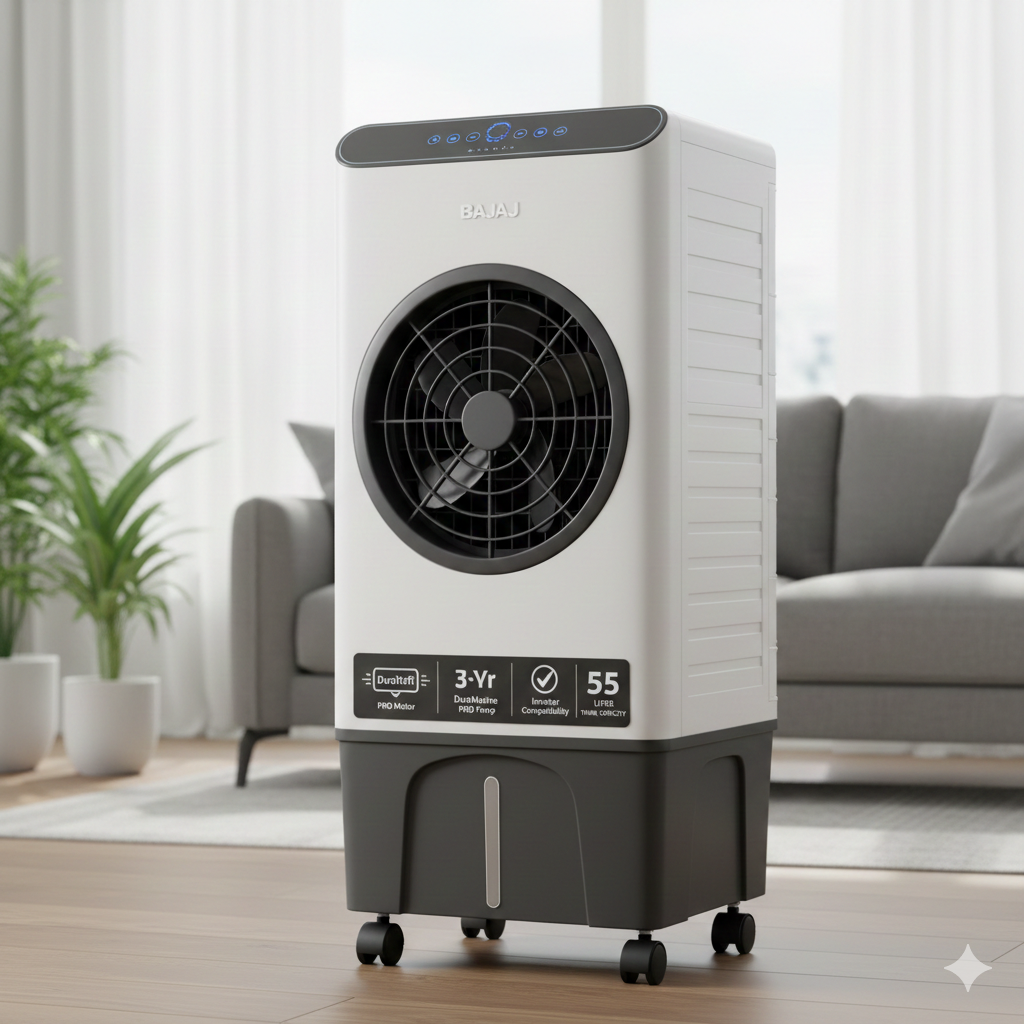 Bajaj Shield Series Solair 55 Liter Desert Cooler for Home | DuraTuff PRO Motor | DuraMarine PRO Pump | 3-Yr Warranty | Inverter Compatibility | Anti-Bacterial Hexacool Master| White