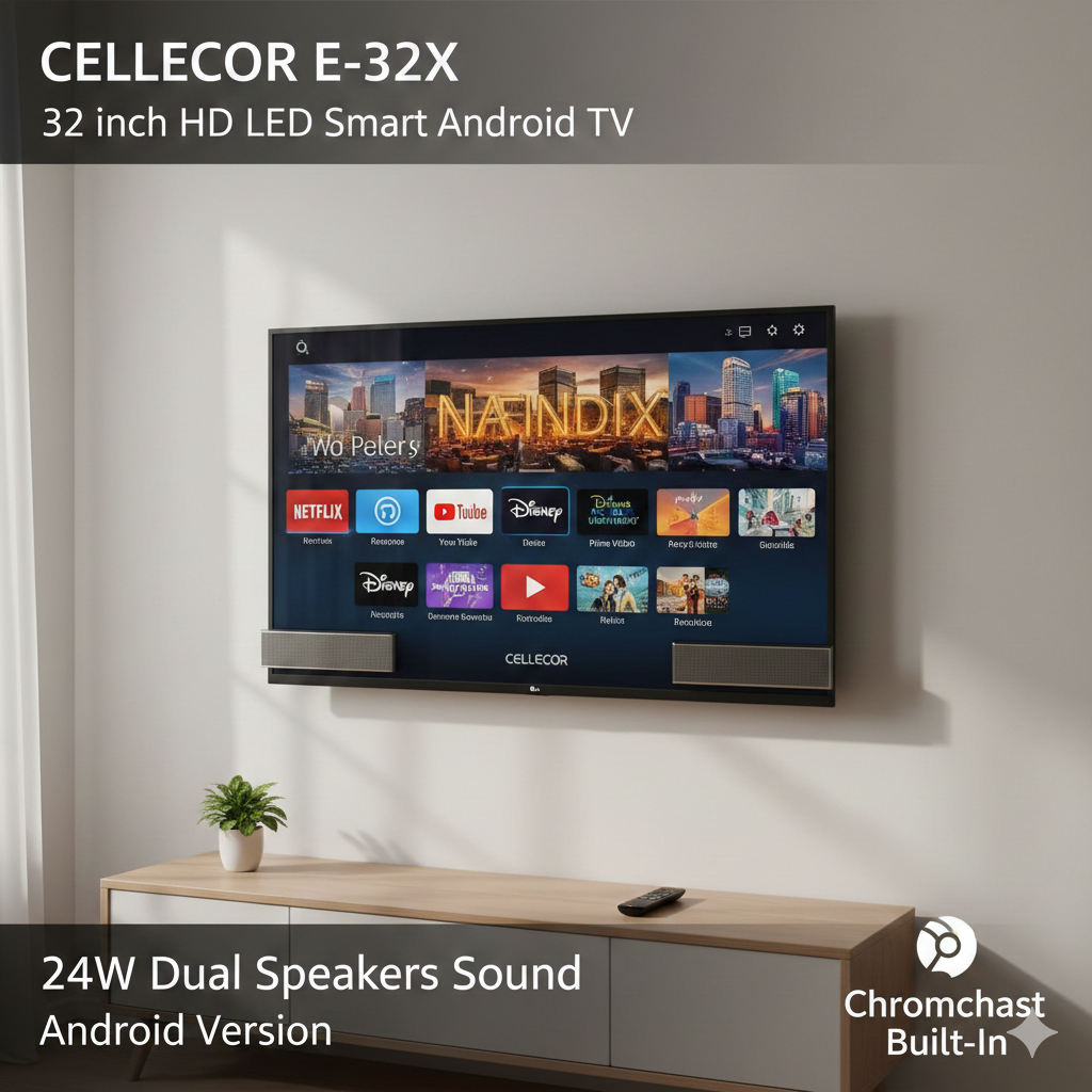 CELLECOR E-32X (32 inch) HD LED Smart Android TV, 24W Dual Speakers Sound, Android Version, Chromecast Built-In. provide dicrion in bulet