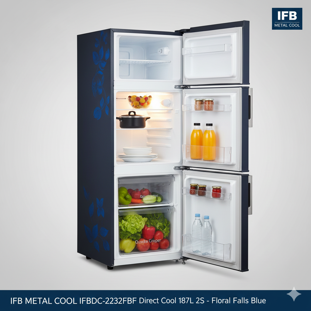 The METAL COOL IFBDC-2232FBF is an 187L (or 197L capacity) 2-Star Direct Cool Single Door Refrigerator from IFB, featuring ‘Converti Cool’ tech for versatile cooling, Copper Boost for hygiene/cooling, toughened glass shelves, a metal ice tray, and available in a blue floral design, ideal for efficient, budget-friendly refrigeration with added hygiene features.