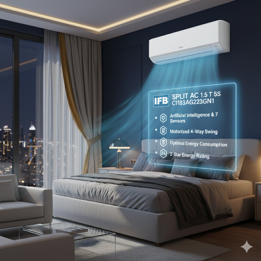 The IFB CI1832A223GN1 is a 1.5 Ton, 3-Star, AI Inverter Split Air Conditioner from IFB’s Advance Series, featuring an HD Inverter Compressor, Copper Condenser, R32 refrigerant, 8-in-1 Convertible Modes for flexible cooling, Wi-Fi compatibility, and durable Nanotek coating on evaporator tubes for efficient, reliable, and energy-saving cooling suitable for medium-sized rooms.