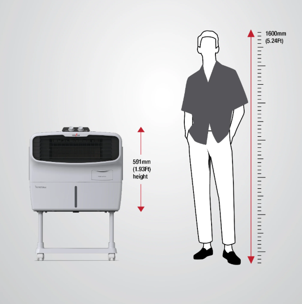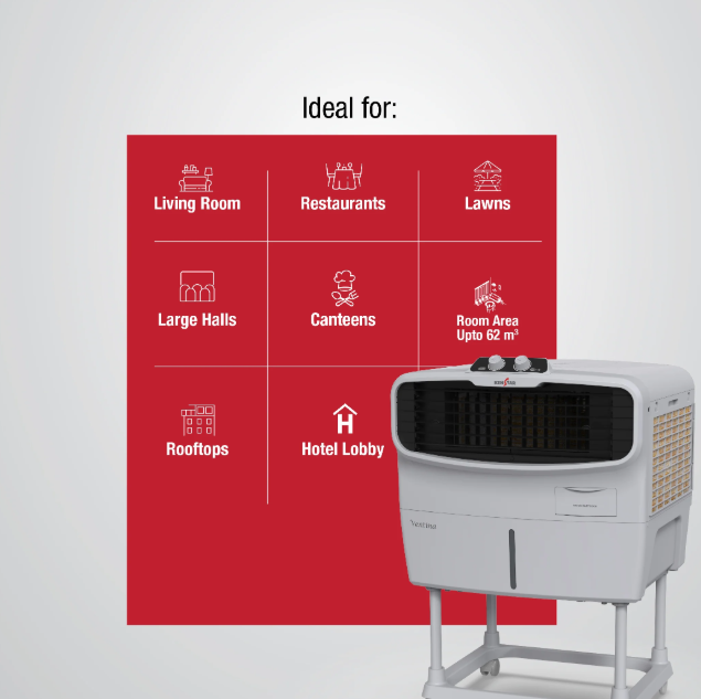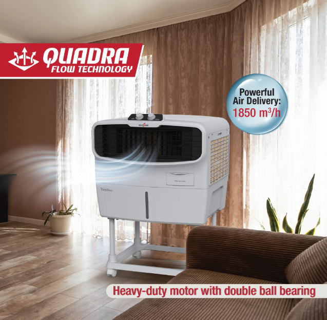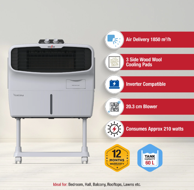 The VENTINA 60 litre air cooler is designed for efficient cooling in compact spaces. With an air delivery of 1850 m³/h, it ensures effective airflow and comfort. Its three-side wood wool cooling pads enhance water retention for better cooling efficiency. Powered by a heavy-duty double ball bearing motor, it offers strong air throw, complemented by a 20.3 cm blower for maximum airflow. Despite its powerful performance, it consumes only 210 watts, making it an energy-efficient choice. With a 60-litre tank capacity, it provides long-lasting cooling without frequent refills.